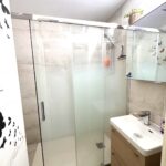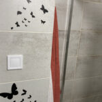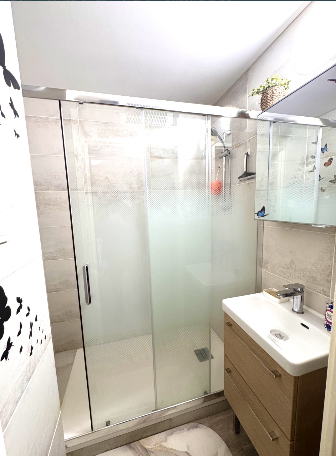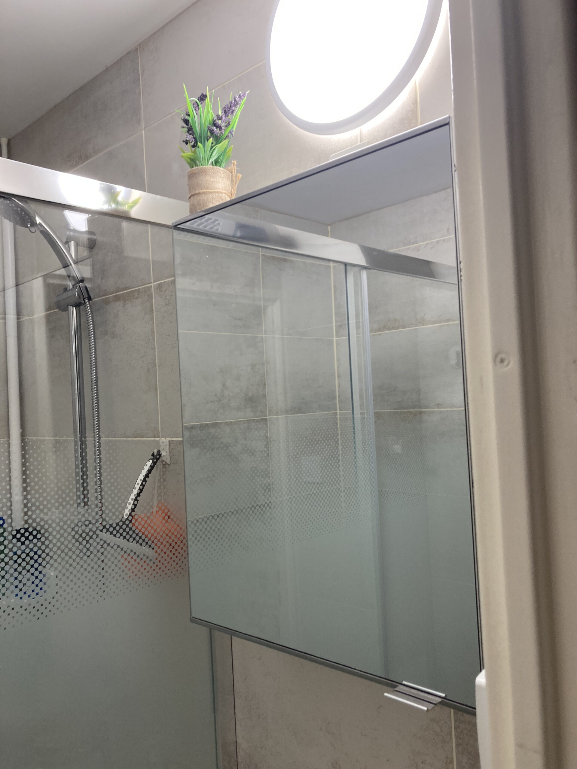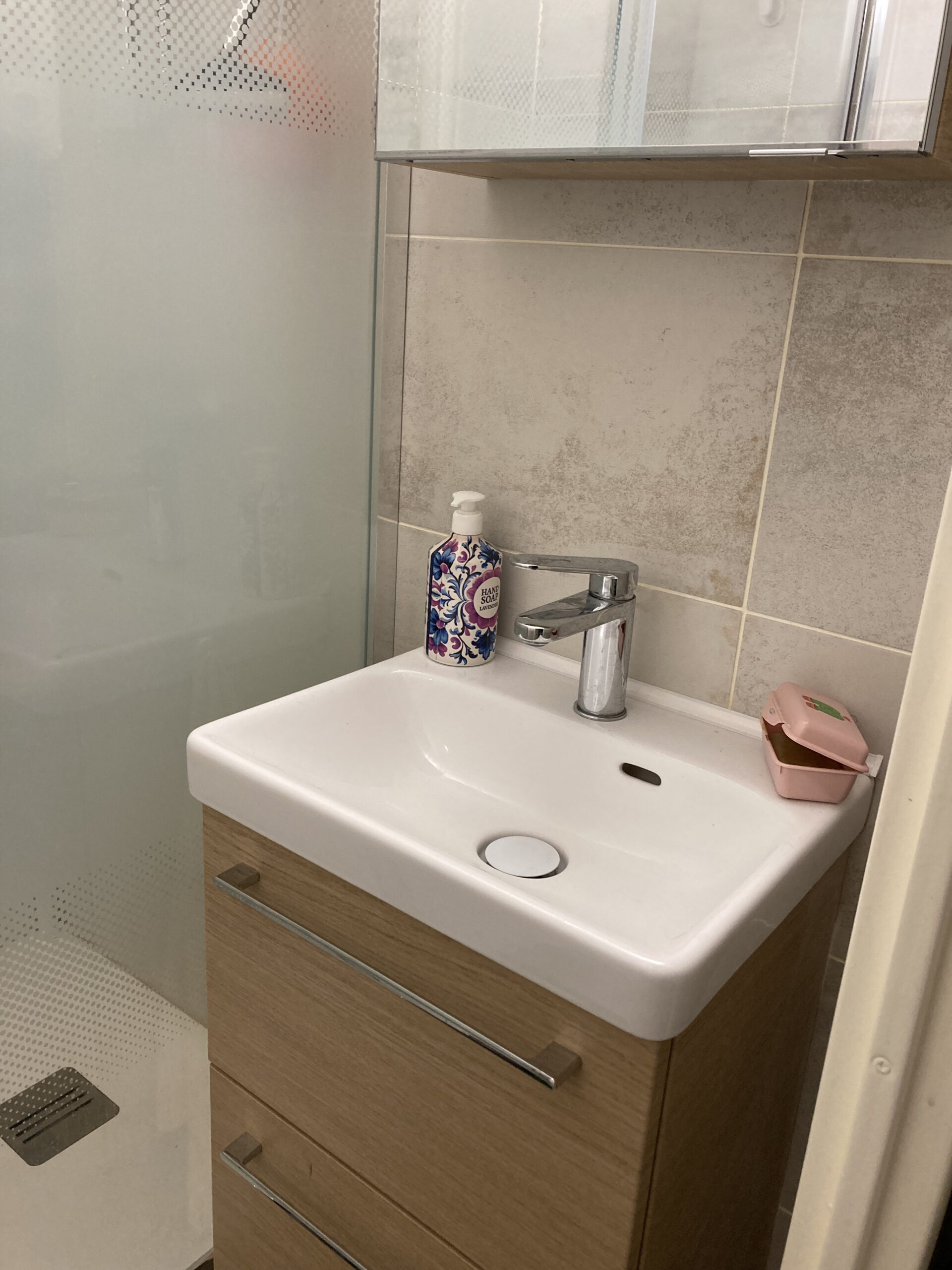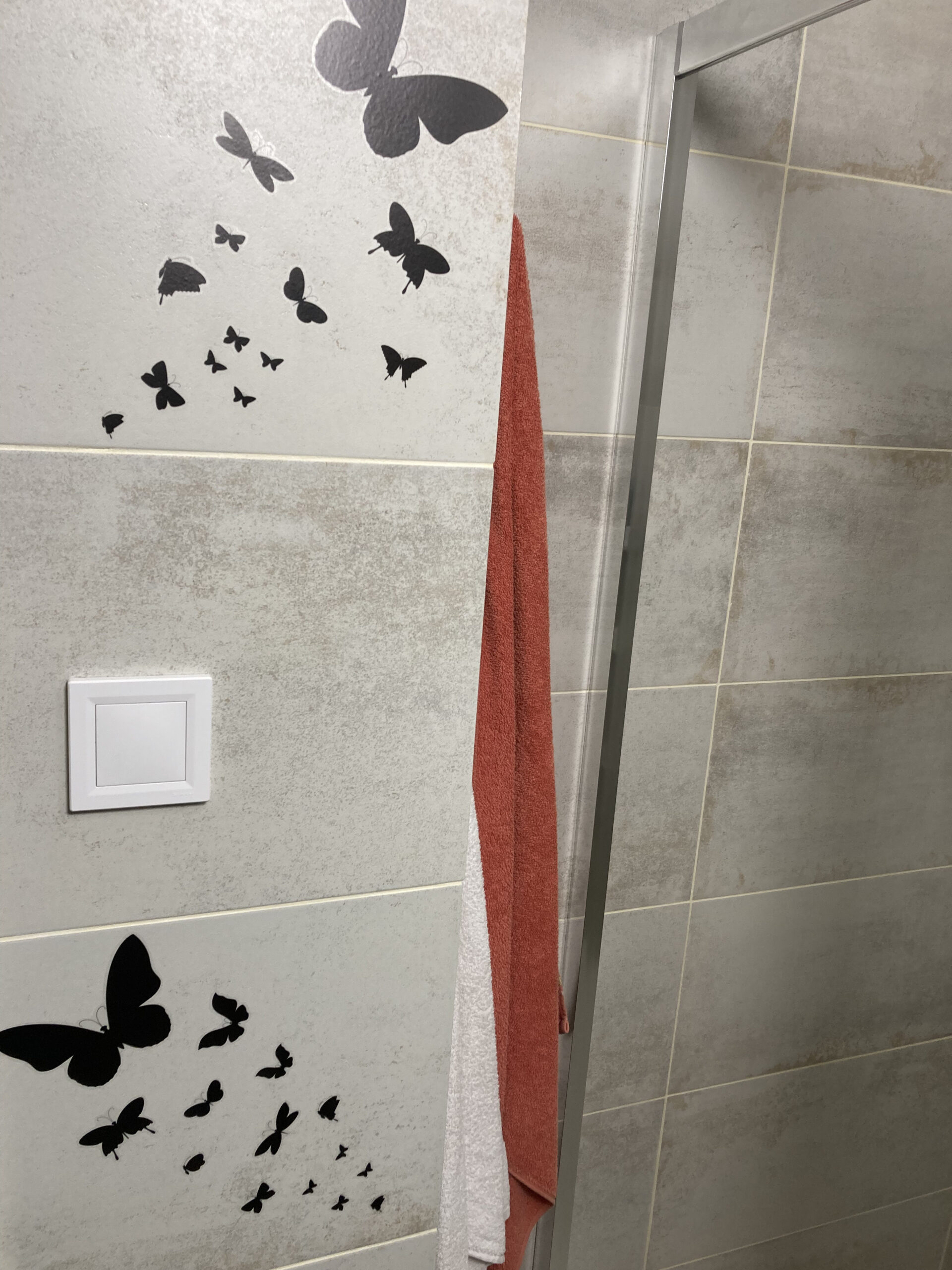 une salle de bain avec sèche cheveux et WC indépendant