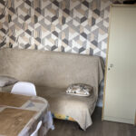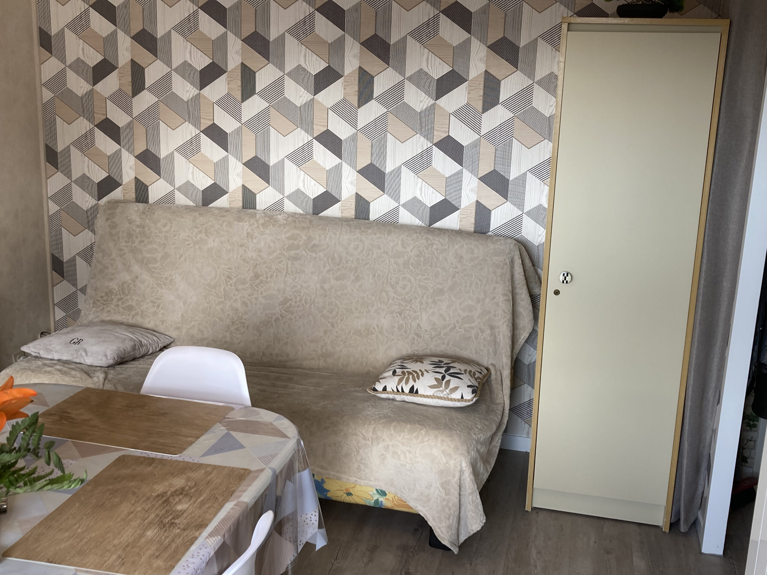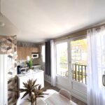 un spacieux séjour avec balcon exposé Sud, un clic-clac pour 2 personnes avec télévision et coin repas.
