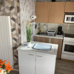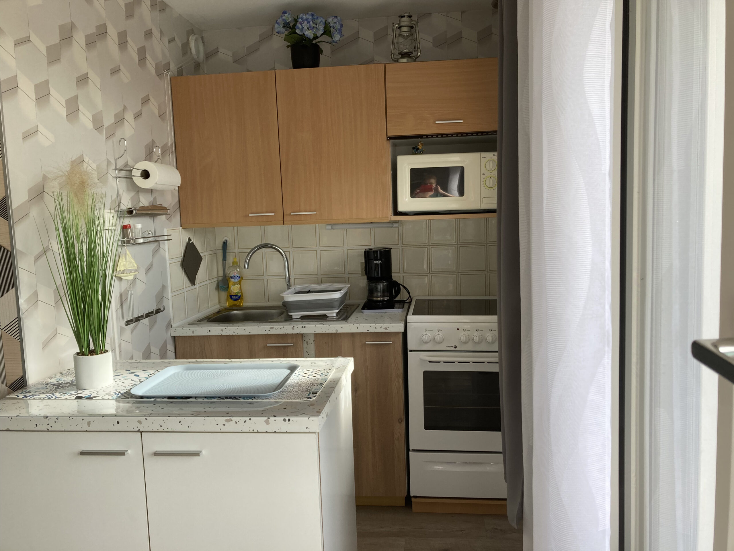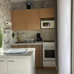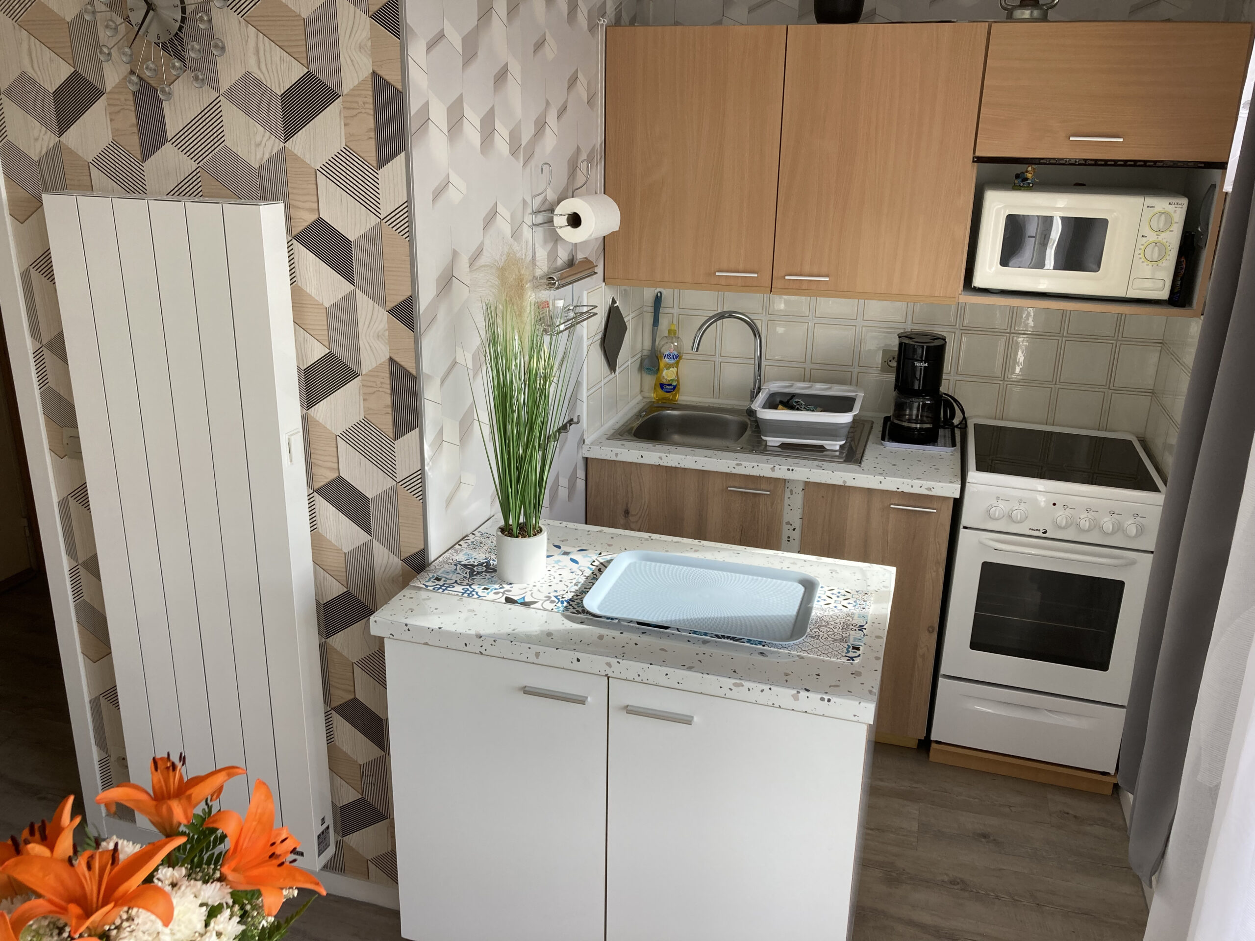 un coin cuisine équipé de : réfrigérateur, four, plaques vitrocéramiques et micro-ondes, bouilloire.