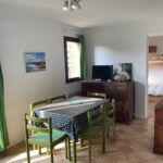 entrée avec placards, séjour avec un canapé convertible, coin repas et TV.