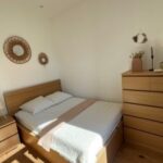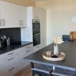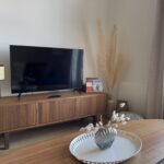 D’un spacieux séjour avec canapé convertible et télévision écran plat, une cuisine ouverte équipée de : grand réfrigérateur avec partie congélateur – Four – micro-ondes, plaques à induction et lave vaisselle.