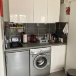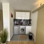 Un coin cuisine équipé : réfrigérateur, plaques vitro, lave linge et micro-onde.